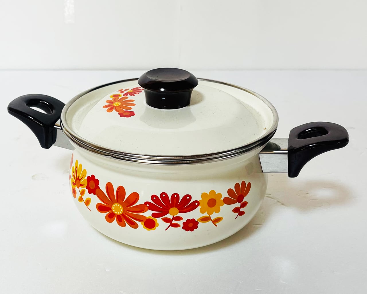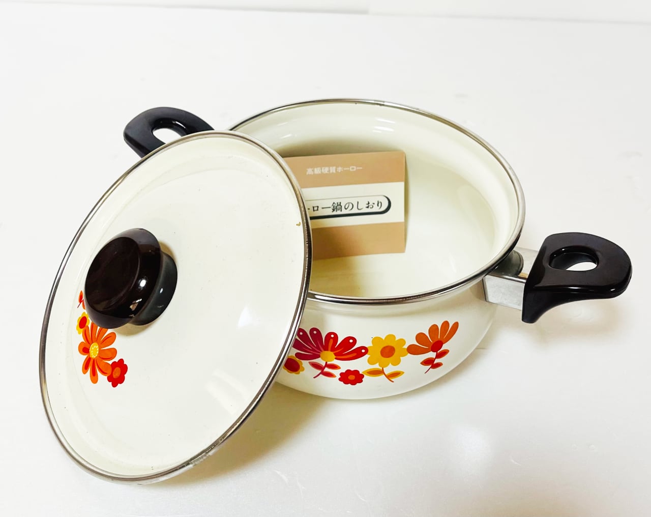 このホーロー両手鍋は、可愛らしい花柄デザインが特徴で、キッチンに明るさを加えます♪
