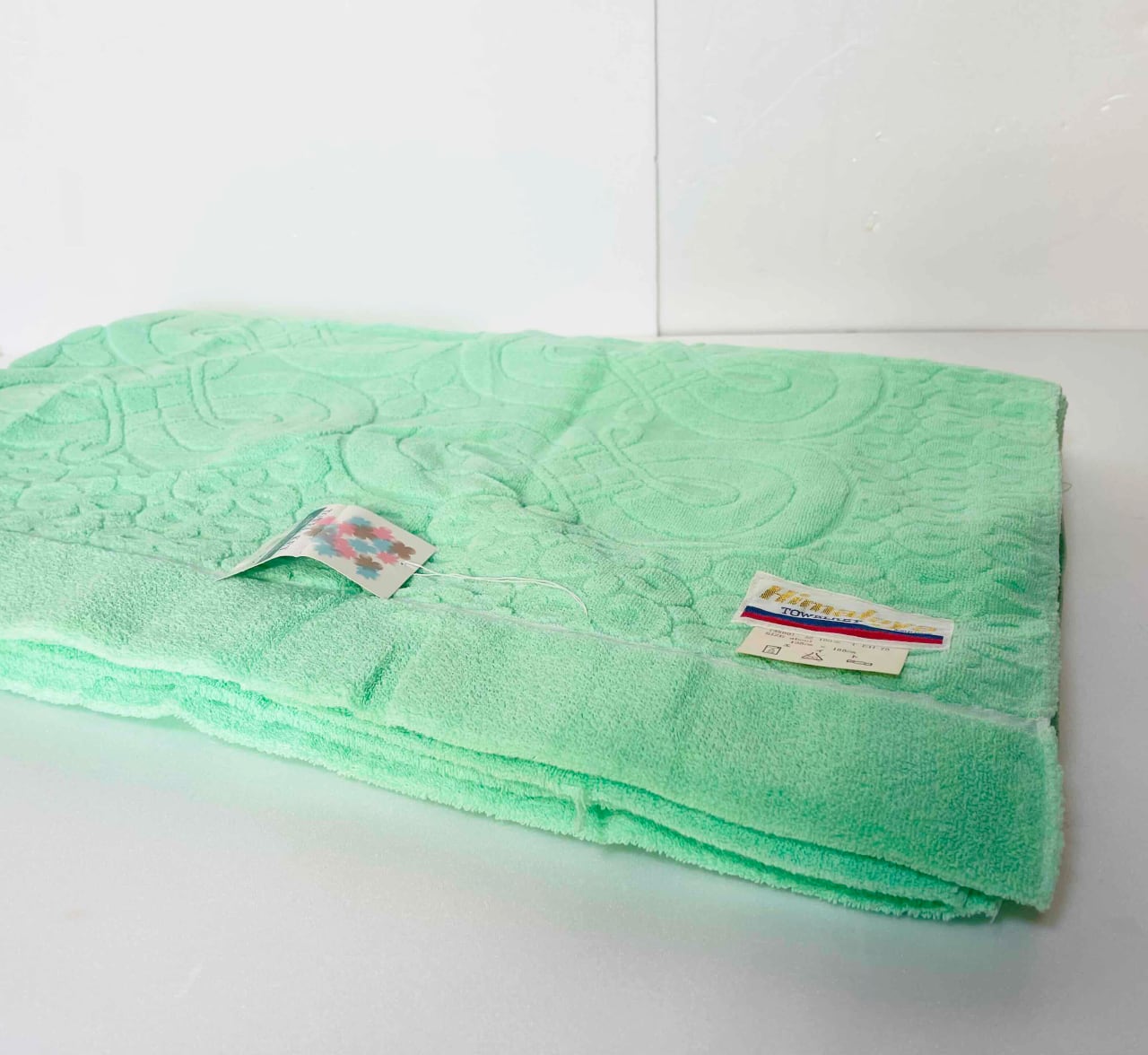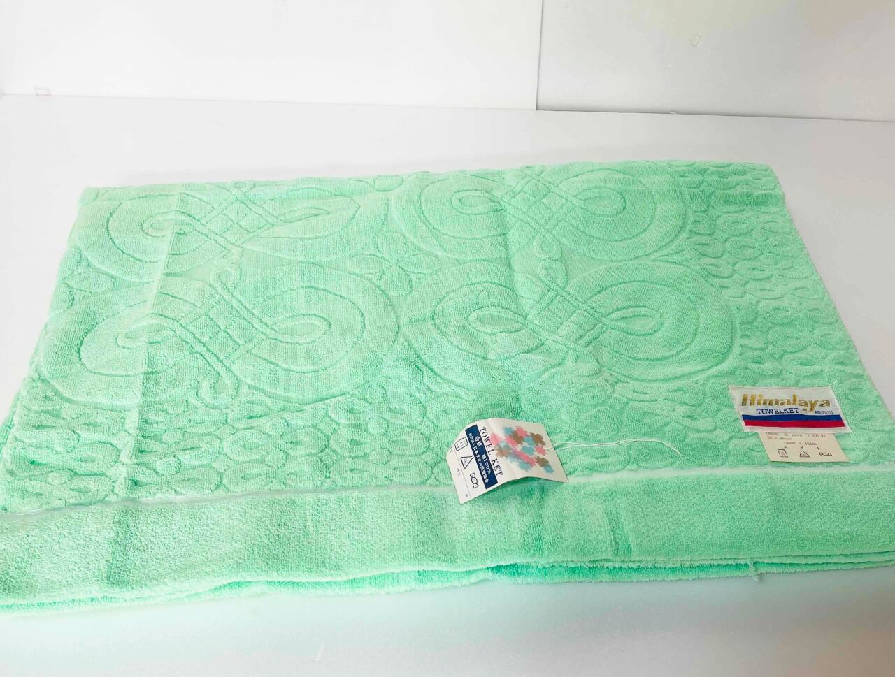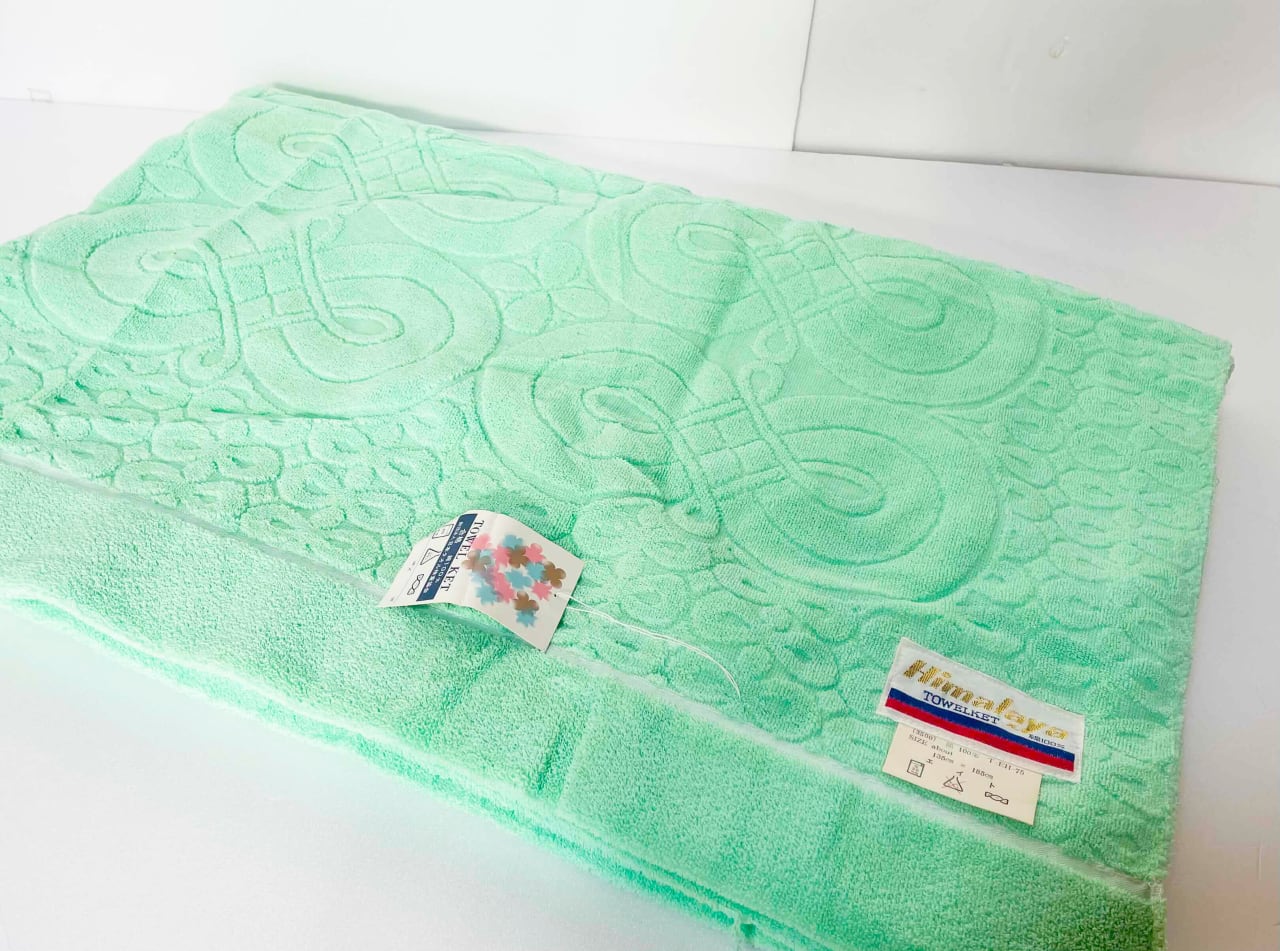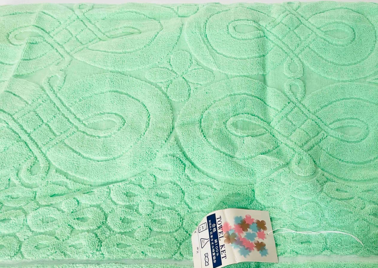 このタオルケットは、レトロポップなカラーデザインが特徴で、グリーンの色合いが印象的です♪
